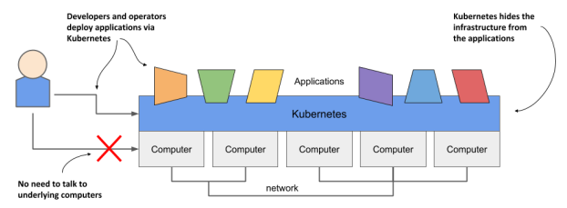 아래의 사진에서 나와있듯이 개발자는 application을 networt나 computer에 대한 고려 없이 Kubernetes level 위에서 실행시킬 수 있다.
