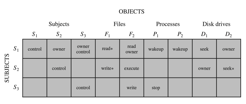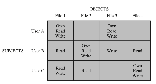 이 행렬은 authorizatoin 과정에서 쓰이는데, user가 file1 에 대해 읽기권한을 요청하면, 요청이 access control system으로 넘어가 메세지가 생성되고, 해당 메세지는 해당 자원에 대한 controller으로 넘어가 matrix를 읽고 file1 에 대해 읽기권한이 user에게 존재하는지 확인 후에 권한을 부여할 지 결정합니다.