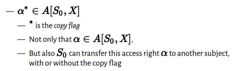 예를들어, a라는 권한은 s0에 의해 다른 subject에게도 해당 a라는 권한을 부여할 수 있는데, 만약 권한을 수정하여 다른 subject에게 a권한을 부여하는 경우, 권한을 부여받은 사용자도 또 다른 subject에게 권한을 부여할 수 있을지 없을지 copy flag을 이용해 지정해줄 수 있습니다.