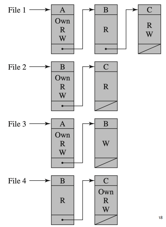 Access right : 대표적으로 read(copy or print),write(add, modify, delete, read), Delete, Create( file, record, field를 생성 ), Search(list a file in directory or Search for the directory)