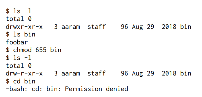 이때, 디렉터리에 대한 실행권한이 없으면 해당 디렉터리로 진입도 못하고, 파일 목록조차 열람할 수 없음. 즉 실행권한이 없다면 read write권한이 있어도 기능을 제대로 사용하지 못할수도 있음