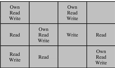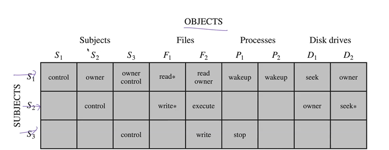 controller은 matrix를 읽어, 접근 권한 유형이 행렬에 존재하는지 즉, 의 X에 대한 a권한이 존재하는지 확인함. 만약 있다면 allowed됨.