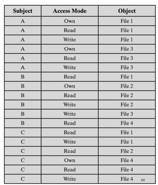 행과 열은 subject와 object으로 이루어져있는데, 행에는 시스템상의 모든 user으로 이루어져있고, 열에는 시스템 상에서 자원을 표현하고 있음.