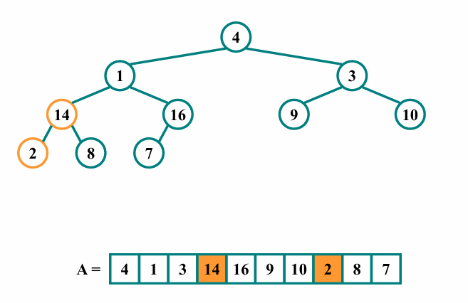 루프의 각 반복 동안, HEAPIFY(A,i,n)을 호출합니다. 이 함수는 다음과 같은 과정을 통해 노드i를 루트로 하는 부분트리가 최대합이 되게 합니다.