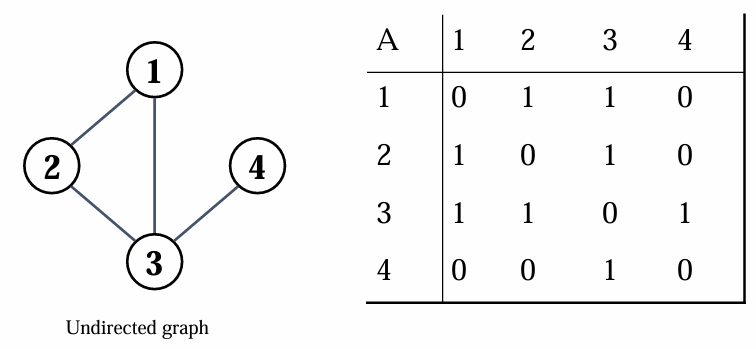 방향이 없는 그래프의 경우, (u,v) = (v,u) 이므로 행렬은 대칭행렬입니다.