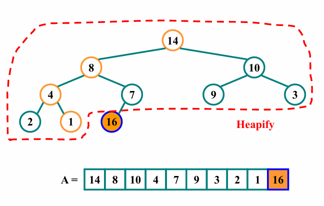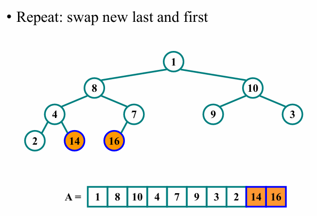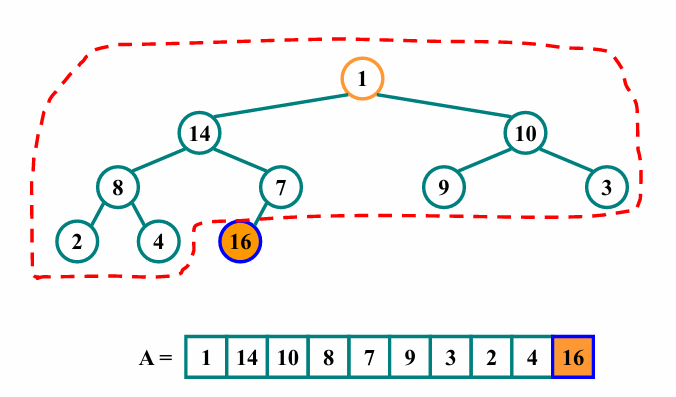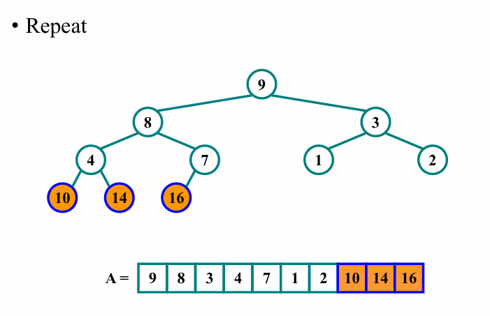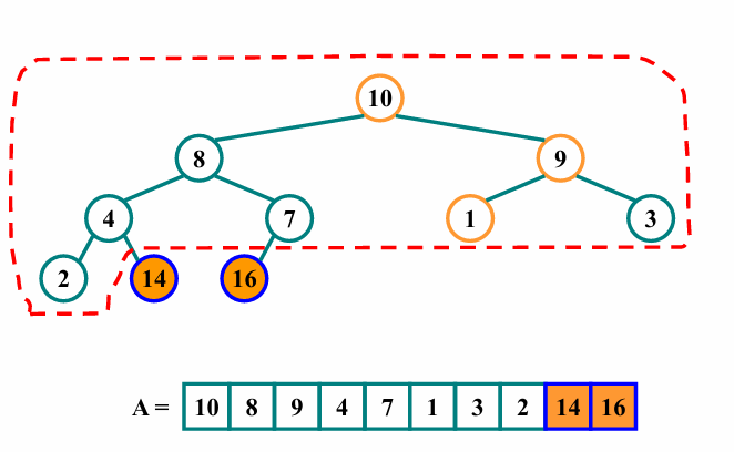 - 마지막노드는 leaf node이므로 정렬됐지만, 마지막 노드를 제외한 root노드를 트리로 하는 배열은 아래와 같이 최대힙의 속성을 위배합니다.