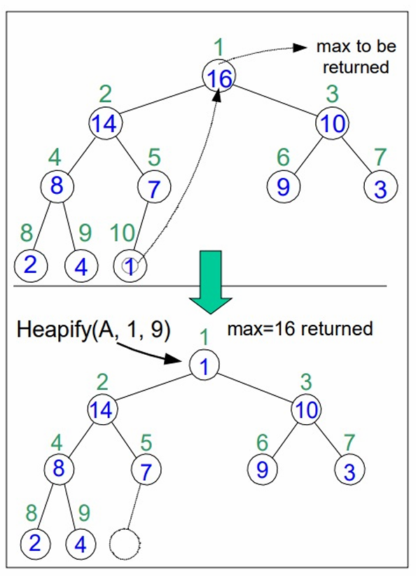 Extract Max(A,n)max←A[1]A[1]←A[n]n←n−1HEAPIFY(A,1,n)return max