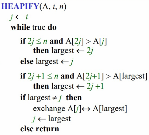 if 2i≤n and A[2i]>A[i] thenlargest←2ielse largest←iif 2i+1≤n and A[2i+1]>A[largest] thenlargest←2i+1if largest =i thenexchange A[i]↔A[largest]HEAPIFY(A,largest,n)else return