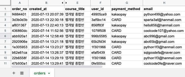 - 필드: order_no, created_at, course_title, user_id, payment_method, email 각각이 필드.