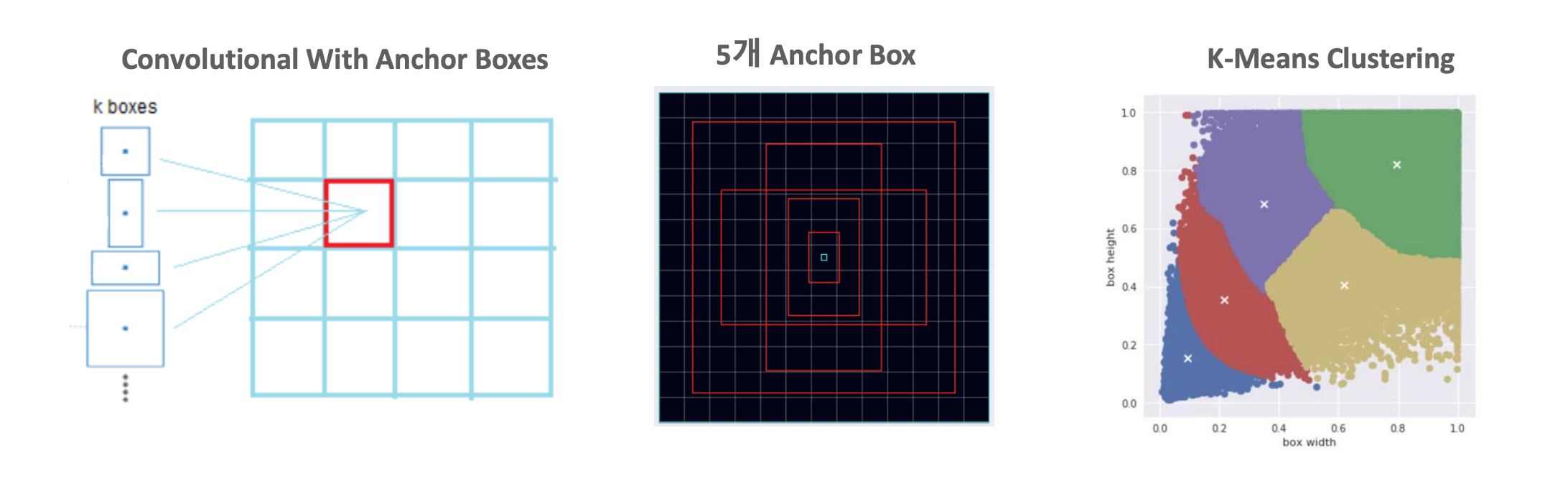 - Anchor Box의 크기와 비율은 YOLOv2에서 K-Means Clustering을 통해 학습함