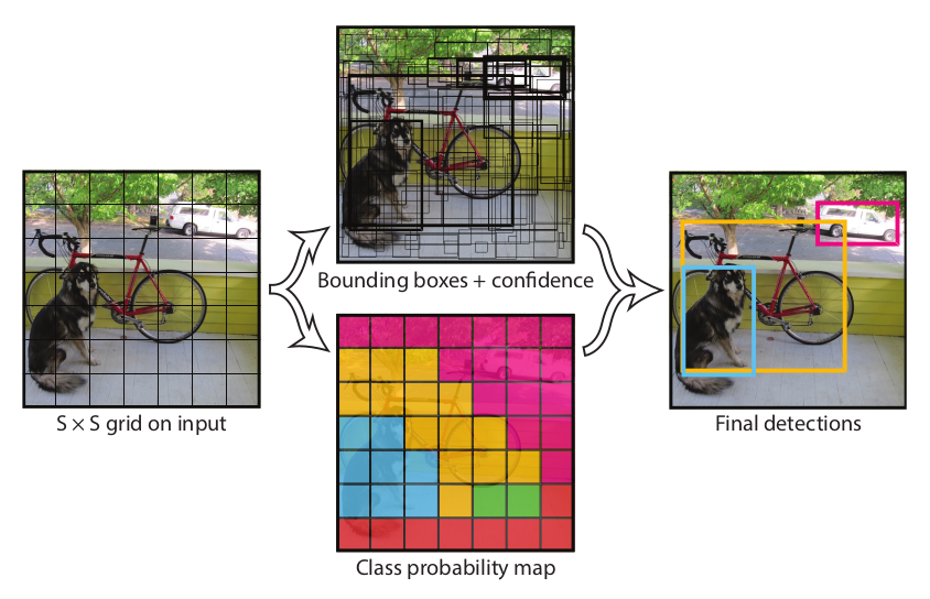 YOLO의 기본 구조는 "이미지를 그리드로 나누고, 각 그리드 셀이 바운딩 박스와 클래스 확률을 예측" 하는 방식