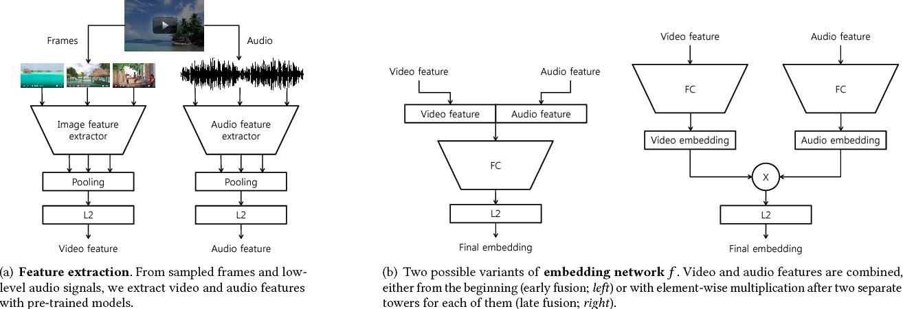 프레임과 오디오의 피쳐를 뽑아 anchor와 negative는 멀도록, anchor와 positive는 가깝도록 임베딩 모델 학습을 진행한다. 이때 특정 비디오를 보고 선택한 비디오들을 연관이 있다고 생각하여 postive pair라 여기고 인근 노드에 배치한다. 아닌 것들은 거리가 먼 노드에 배치함으로써 비디오 연결 관계를 그래프 형식으로 빌드하고 이를 통해 각 데이터셋을 마련한다. 이를 통해 비디오 임베딩을 뽑아내고 Nearest neighbor search, user modeling, classifier 등 다양한 곳에서 활용 가능하다. 한계점은 negative pair를 효과적으로 뽑아내기 위해서 batch size를 크게 잡아야 한다는 점이 있다.