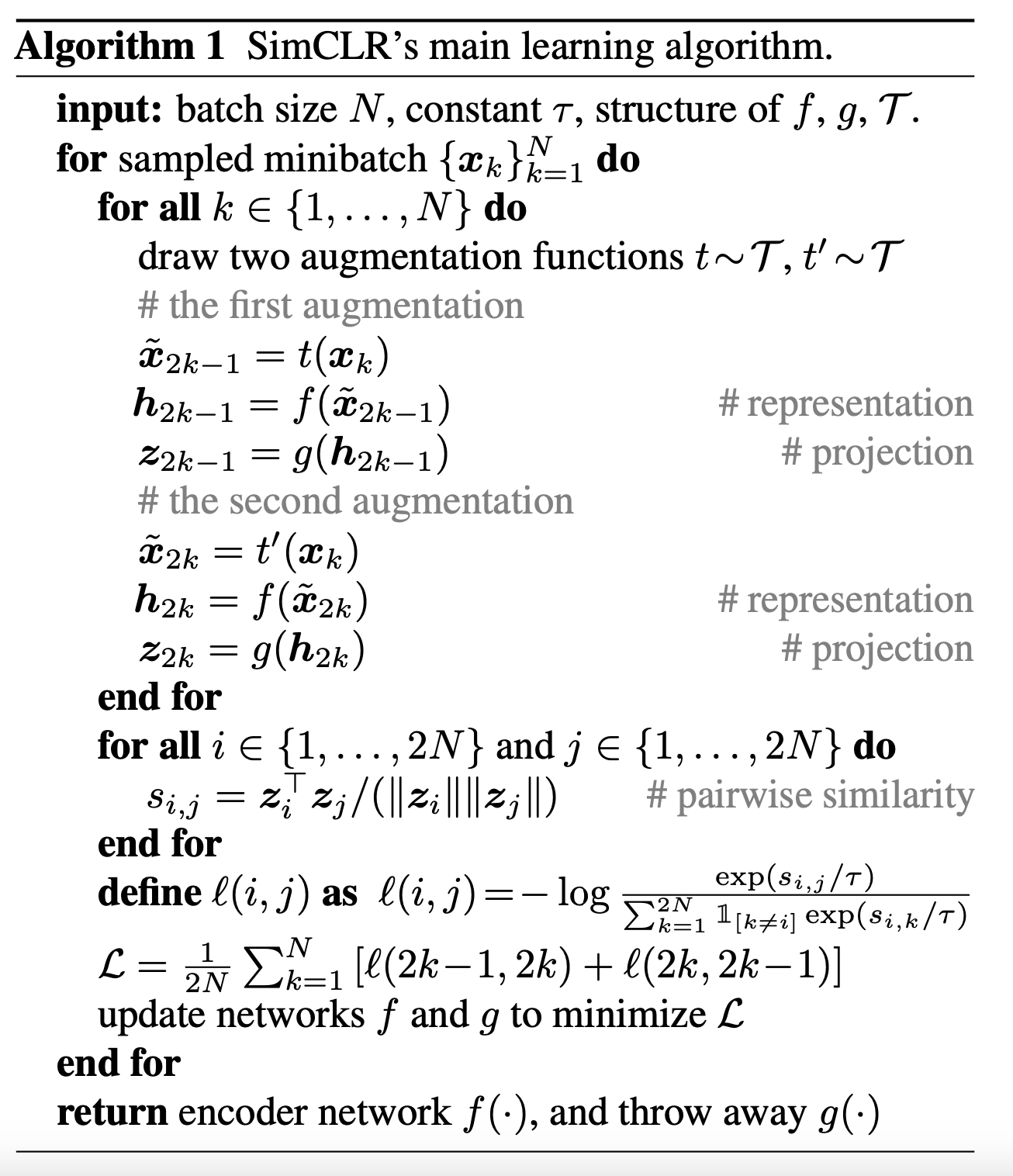 simCLR의 구조는 아래와 같다. Data Augmentation을 통해 하나의 이미지를 여러 유사한 이미지로 만든 후 인코더에 집어넣는다. 이렇게 만들어진 1차적인 임베딩을 projection을 시켜 2차 임베딩을 뽑는다. 같은 이미지로부터 나온 2차 임베딩들은 유사하도록 학습이 된다(positive pair). 그 이외 negative pair로는 batch에 있는 나머지 이미지들을 사용한다.