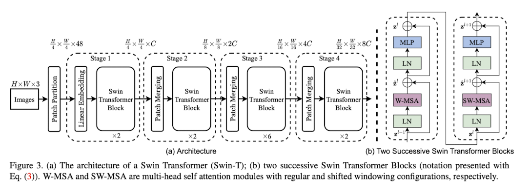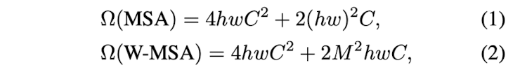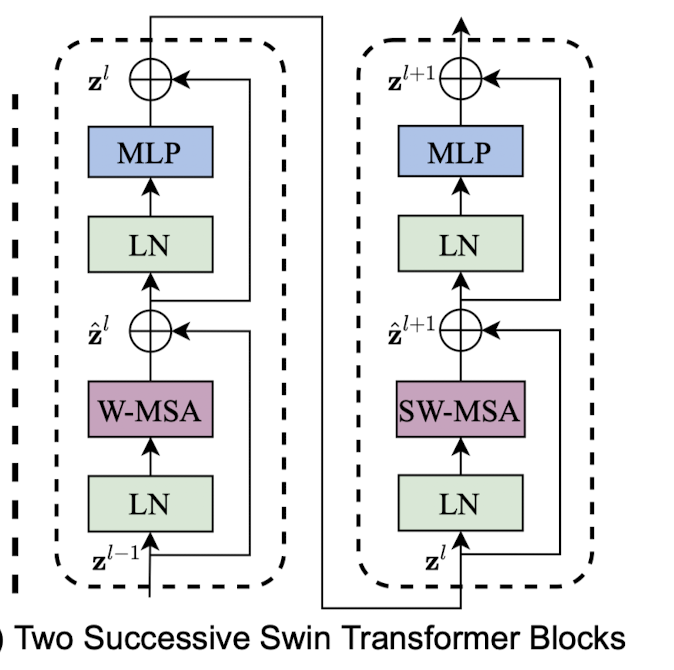 여기서 과 은 각각 W-MSA와 MLP 모듈의 output이다. 그리고 W-MSA와 SW-MSA는 각각 일반적인 윈도우를 사용한 멀티헤드와 shifted window partitioning을 사용한 멀티헤드 어텐션이다.