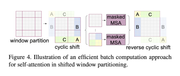 shifted window partitioning는 만일 () 에서 ()로 window를 shift할 때, 몇개의 window가 MxM보다 사이즈가 작아지는 경우 문제가 발생한다. 가장 기본적인 해결책은 padded 값을 첨가하는 것이다. 하지만 이 방법은 윈도우 개수도 동시에 증가시키게 만들기 때문에 computation cost가 증가된다. 저자는 이러한 점을 보안하기 위해 cyclic-shifting 방법을 사용하기로 했다. 이러한 shift 이후에는 batched window가 여러개의 sub-window로 구성된다. cyclic-shifting을 이용하면 윈도우 개수는 그대로 유지된다는 장점이 있다. 원리는 위의 그림과 같다. (정확힌 원리는 코드를 뜯어봐야지 알 수 있을 것 같다.)