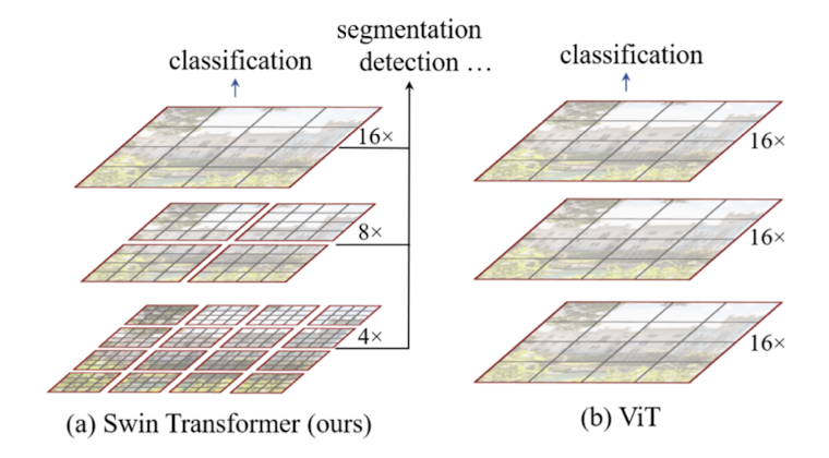 -> 기존 ViT는 이미지에. globally하게 self-attention을 적용하여ㅑ 이미지 사이즈에 따라 quadratic complexity를 지니고 있다. swin transformer는 이미지 패치들을 merging함으로써 hierarchical feature map을 만든다. 그리고self-attention을 이미지 전체에 적용하는 것이 아닌, 일부분에 적용함으로써 image size에 따른 linear complexity를 지니고 있다.