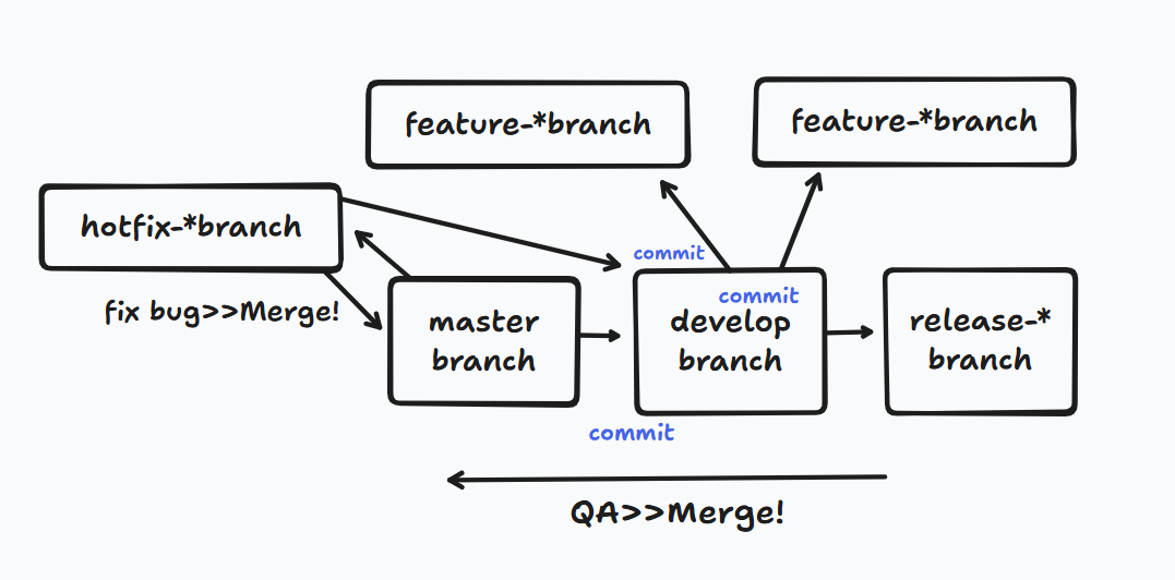 : master branch에서 develop branch를 만든 후, develop branch에서 다시 feature branch로 나눠서 작업 후 develop branch로 다시 merge!⭐
