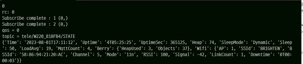 본격적으로 MQTT Subscriber 프로그램을 구현할 차례이다. 테스트로 간단한 구독자 프로그램을 구현해 수신한 데이터를 출력하면 다음 그림과 같은 결과를 얻을 수 있다.