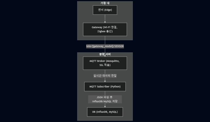 해당 다이어그램은 각 가정의 센서에서 시작해 Gateway를 통해 MQTT Broker로, 그리고 Python 기반의 Consumer에 의해 실시간으로 파싱되어 InfluxDB와 MySQL에 저장되는 데이터 파이프라인을 한눈에 보여준다.