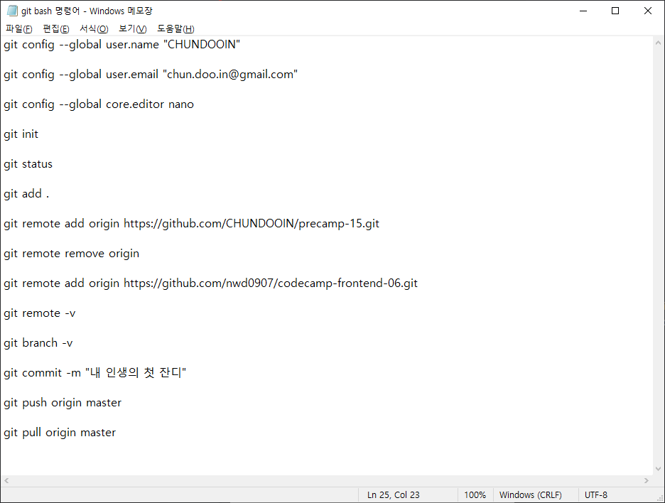 push : 파일을 추가하거나 변경내용을 원격저장소에 업로드하는작업(깃허브에 완전업로드)