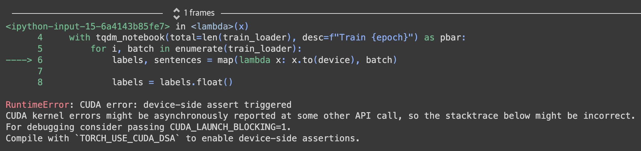 이 오류는 다른 블로그를 찾아보니 classification 수행 도중 class 수가 맞지 않을 때 발생하는 오류라고 했는데 나의 경우는 그것이 아니라 앞서 발생한 CUBLAS_STATUS_NOT_INITIALIZED 오류 때문에 CUDA가 계속 에러를 발생시키는 것 같았다. (확실한? 사유는 모르겠다..) 이 경우 코랩을 다시 실행하고, CUBLAS_STATUS_NOT_INITIALIZED 오류를 해결하였더니 더이상 발생하지 않았다.