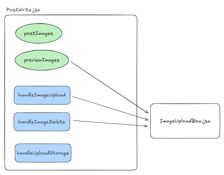 이미지 업로드 폼 구현을 위해서는 위와 같은 상태와 함수, 그리고 ImageUploadBox 컴포넌트가 필요합니다.