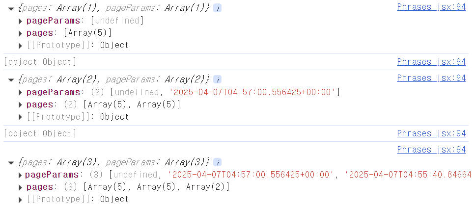 getPhraseList는 인자 pageParams를 cursor 매개변수로 받습니다.