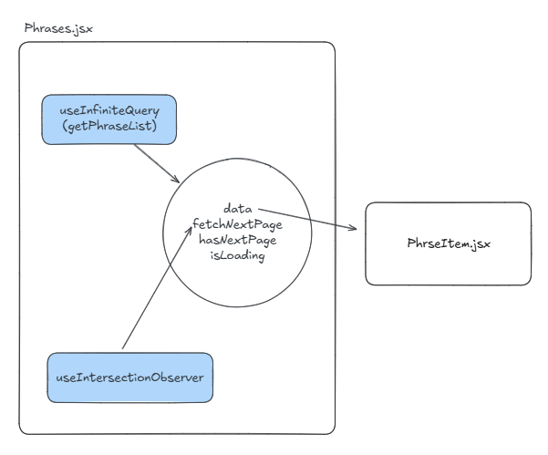 결과적으로 마지막 PhraseItem이 화면에 보여질 때 handleIntersect 함수 안에서 fetchNextPage가 실행됩니다.