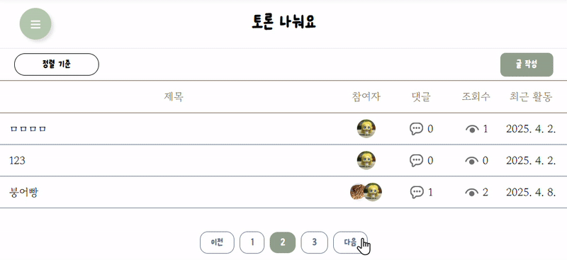 totalPages : 총 페이지 개수입니다.currentGroup : 현재 위치한 페이지 그룹을 나타냅니다. (위 스크린샷의 3페이지에서 다음 버튼을 누르면 currentGroup은 [1,2,3]에서 [4,5]로 바뀝니다.)hasPrev, hasNext : currentPage의 이전, 다음 페이지 존재 여부를 나타냅니다.totalPages, currentGroup, hasPrev, hasNext와 함께 페이지 이동시 currentPage 상태의 값을 변경하고, url에 page 파라미터를 추가하는 handlePageChange 함수가 페이지네이션 UI를 렌더하는Pagination 컴포넌트에 props로 전달되며 페이징이 동작합니다.