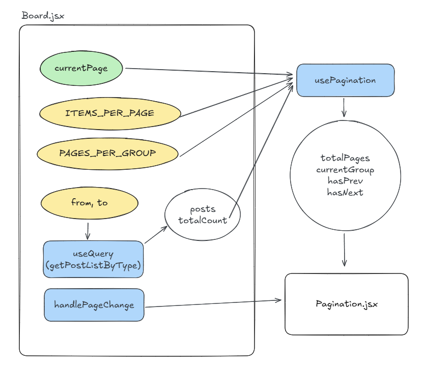 usePagination 훅에 currentPage와 useQuery로부터 획득한 totalCount, ITEMS_PER_PAGE, PAGES_PER_GROUP을 전달하여 사용합니다.