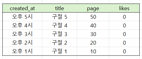 데이터는 기본적으로 created_at 내림차순으로 불러와지고, 이 상황에서 첫 페이지의 데이터는 다음과 같습니다. (created_at은 실제로 ms까지 저장되므로 중복인 경우는 제외했습니다.)