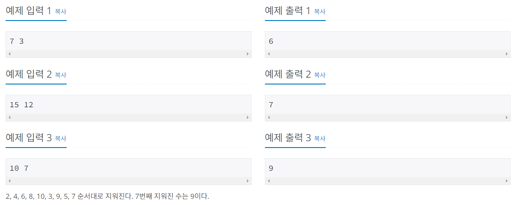 - 수가 지워질 때마다 count를 증가하며, 만약 count가 k와 같을 시 지워지는 수를 출력하고 반복문을 종료