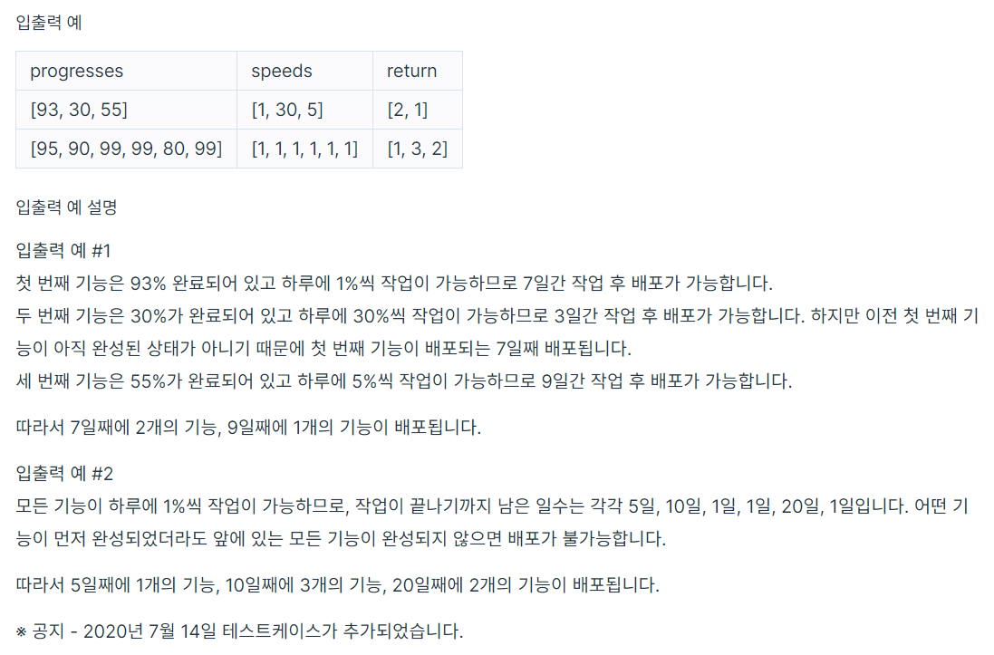 사실 90.9점까지는 풀었는데, 2번과 11번 테스트케이스에서 실패하고 질문게시판의 반례를 찾아봤다. 입력값 [90, 90], [10, 9] 출력값 [1, 1]인데 내 결괏값은 자꾸 [2]가 나왔다. 알고보니 풀이 1에서 arr에 개발에 필요한 소요일수를 저장하면서 계산식에 %대신 /를 잘못 작성했더라 .. 돌이켜보니 Math.ceil()함수를 썼으면 간단했을 듯