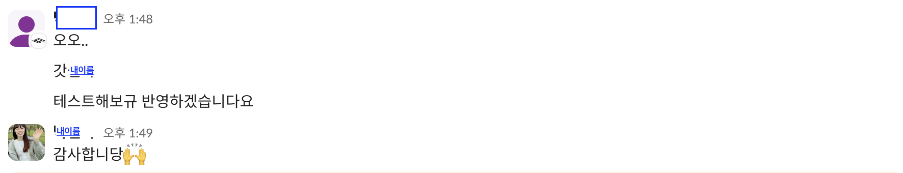 리팩토링해서 고객사에 전달드렸더니, 킹왕짱갓제너럴 내가 항상 존경하는 S 님이 PR 봐주셔서 넘 뿌듯했다 ☺️