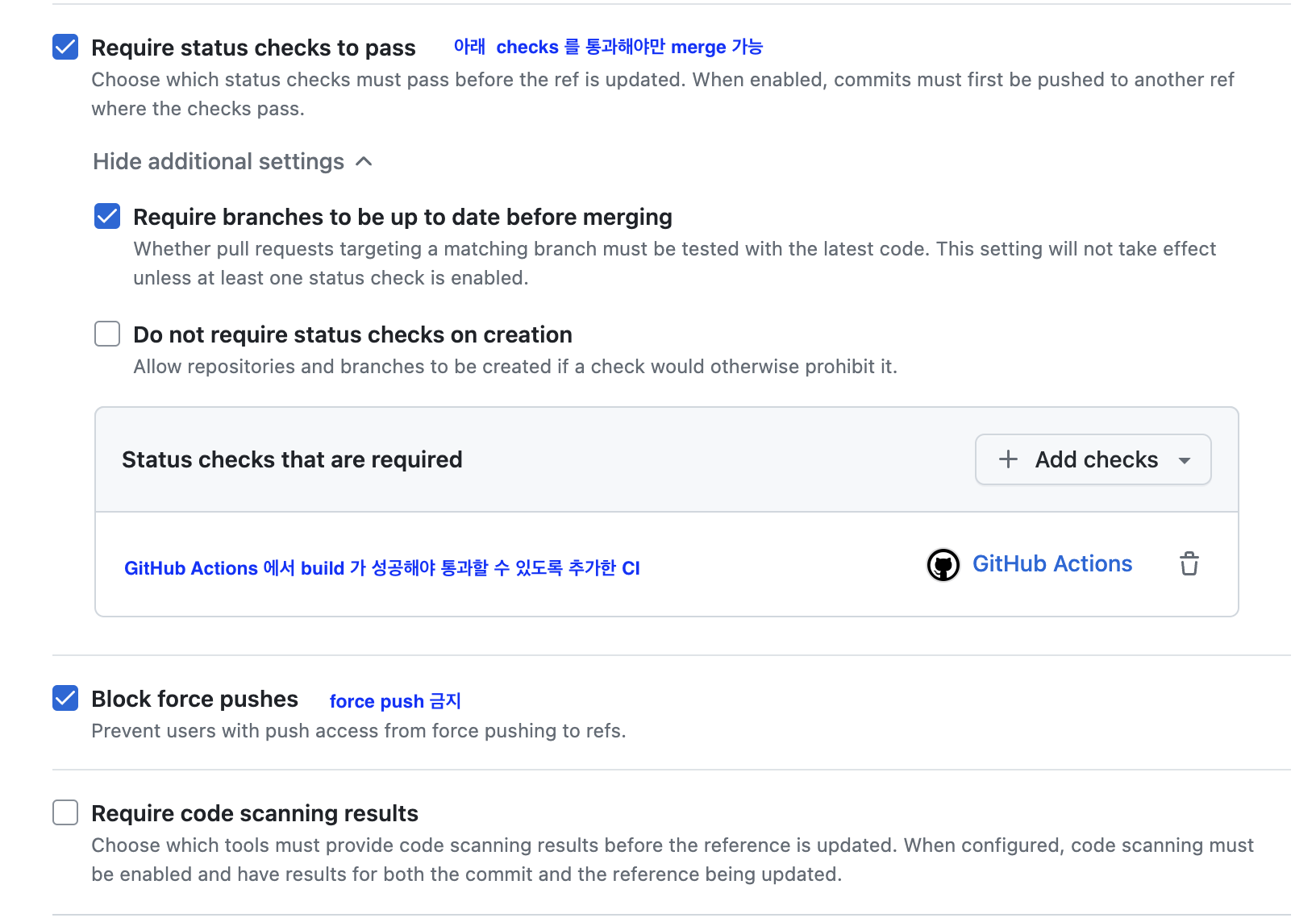 Settings → Branches → Add branch ruleset 에서 적용할 수 있다.