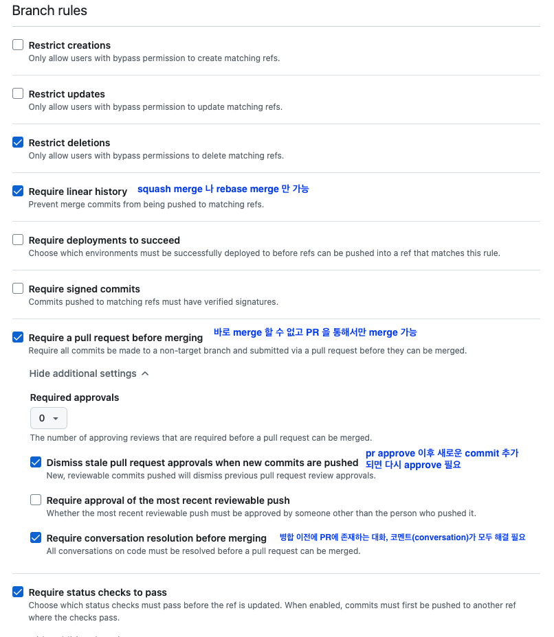main branch 에는 rule set 을 지정하여 PR 을 통해서만 merge 할 수 있고, pr 에 달린 코멘트들이 모두 해결되어야 merge 할 수 있도록 branch rule set 을 지정해 놓았다.