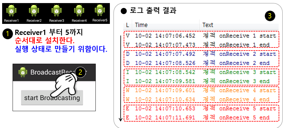 +) 동적 리시버를 순서대로 처리하게 하고 싶다면 sendBroadcast함수 대신 sendOrderedBroadcast함수를 사용하면 된다.