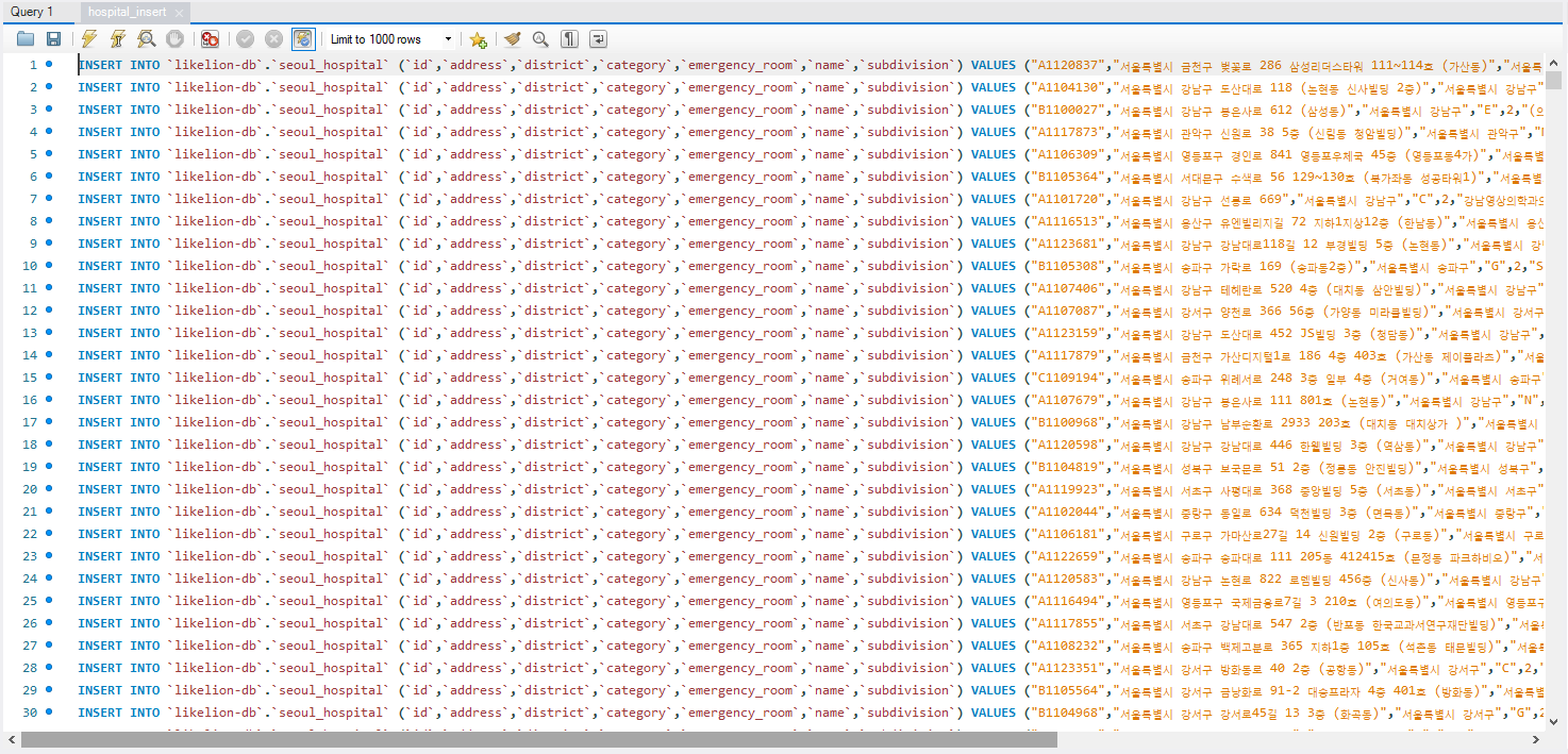 String sql = "INSERT INTO `likelion-db`.`seoul_hospital` (`id`,`address`,`district`,`category`,`emergency_room`,`name`,`subdivision`) " +