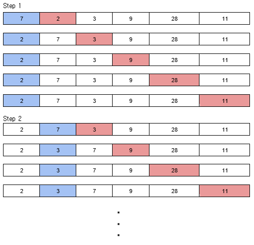 3. 각 Step이 끝나면, 고정된 값에 비교한 숫자 중 가장 작은 숫자가 옴