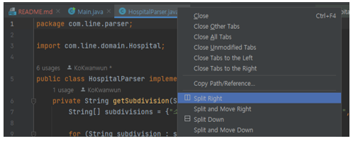 방법 : 작업 Tab의 java파일 오른쪽 버튼 ➡ Split Right, Split Down 중 선택하여 사용
