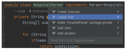 HospitalParserTest : 각 변수마다 잘 Parsing 했는지 테스트, sql insert문으로 잘 전처리했는지 테스트하는 Test 클래스import com.line.domain.Hospital;