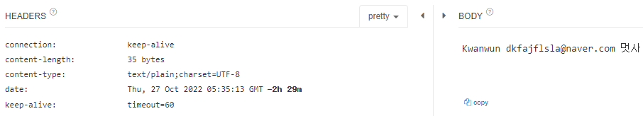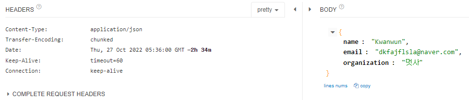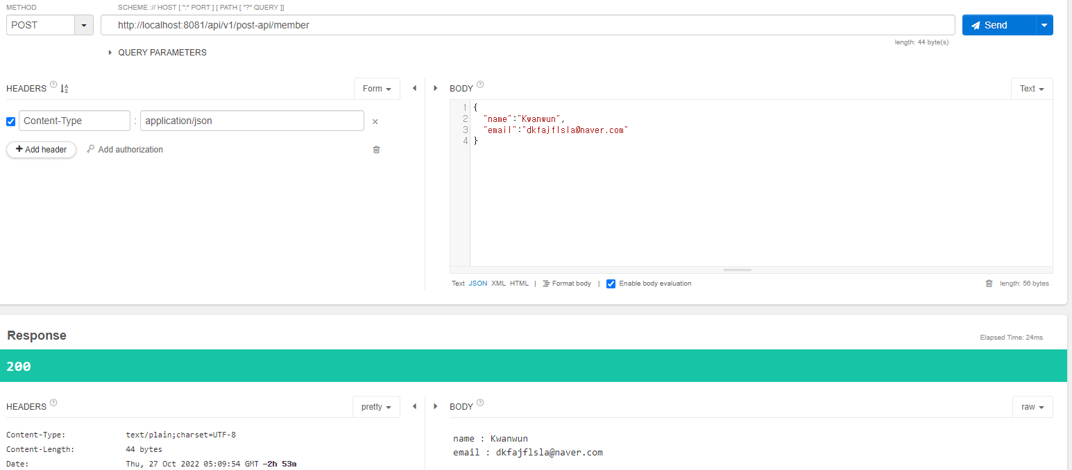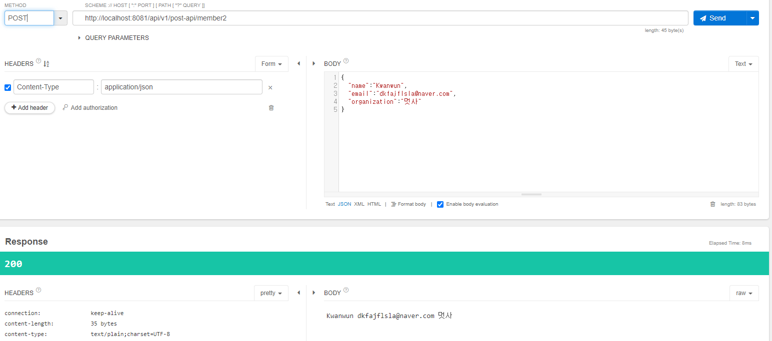 🔸 Body 부분에 json 형식으로 넣어 해당 정보를 출력하도록