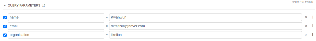@PathVariable)@RequestParam)?since=시간 : 시간 이후의 데이터만 보겠다)http://localhost:8081/api/v1/get-api/request1?name=Kwanwun&email=dkfajflsla@naver.com&organization=likelion& 사용) @GetMapping(value = "/request1")