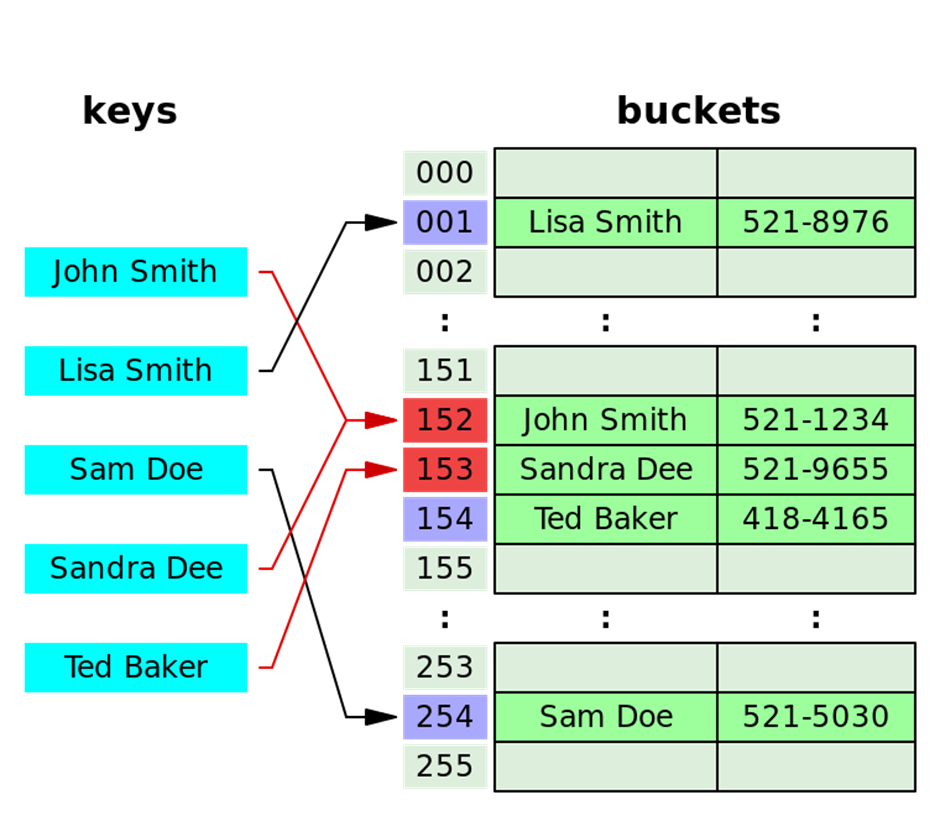 체이닝이란 충돌이 발생했을 때 이를 동일한 버킷(Bucket)에 저장하는데 이를 연결리스트 형태로 저장하는 방법을 말한다. 위 그림을 보면 John Smith 와 Sandra Dee 의 인덱스가 152 로 충돌하게 된 경우인데, 이 때 Sandra Dee 를 John Smith 뒤에 연결함으로써 충돌을 처리하는 것을 볼 수 있다.