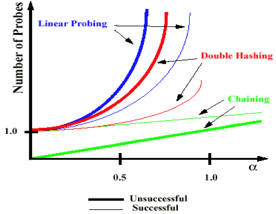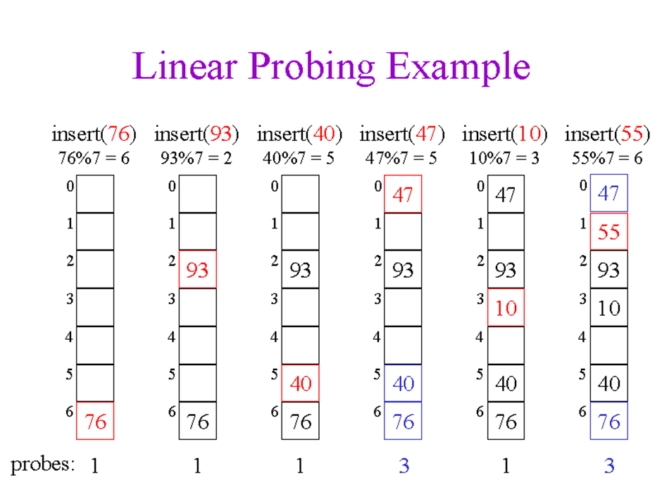 선형탐사는 가장 기본적인 충돌해결기법으로 위에서 설명한 기본적인 동작방식입니다. 선형탐사는 바로 인접한 인덱스에 데이터를 삽입해가기 때문에 데이터가 밀집되는 클러스터링(Clustering) 문제가 발생하고 이로인해 탐색과 삭제가 느려지게 됩니다.
