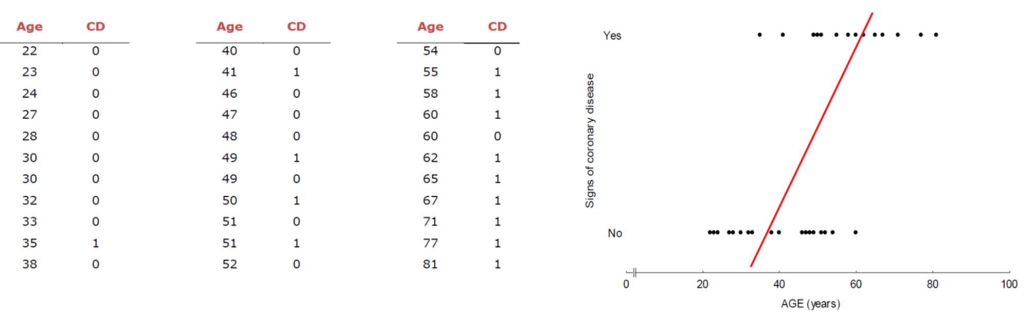 다음 그림은 종속 변수가 범주형 데이터일 때, 선형 회귀선을 적용한 경우를 보여줍니다. 단순 선형 회귀선으로는 데이터의 패턴을 잘 나타냈다고 이야기할 수 없겠죠?