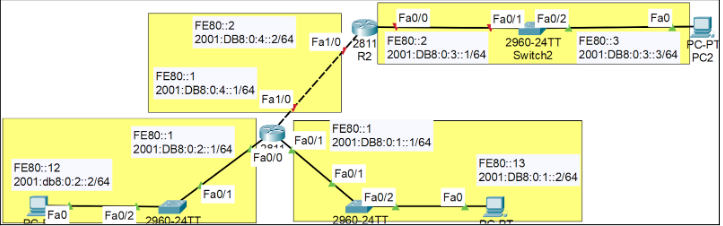 ipv6 route 2001:db8:2::/64 2001:db8:0::2 # LAN2로 향하는 트래픽을 R2를 통해 전달