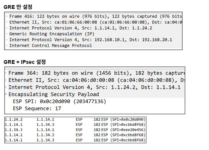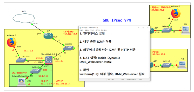 FW1(config)# route outside 192.168.20.0 255.255.255.0 192.168.10.254 //gre 터널 이 후의 지사A