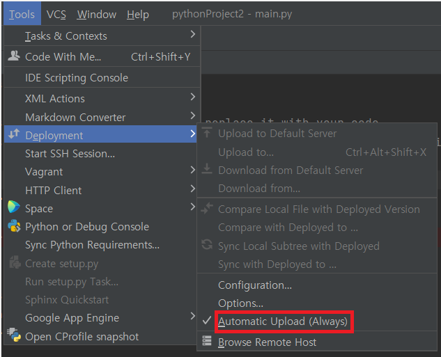 마우스 우클릭 & Upload to Copy of project-level server 선택