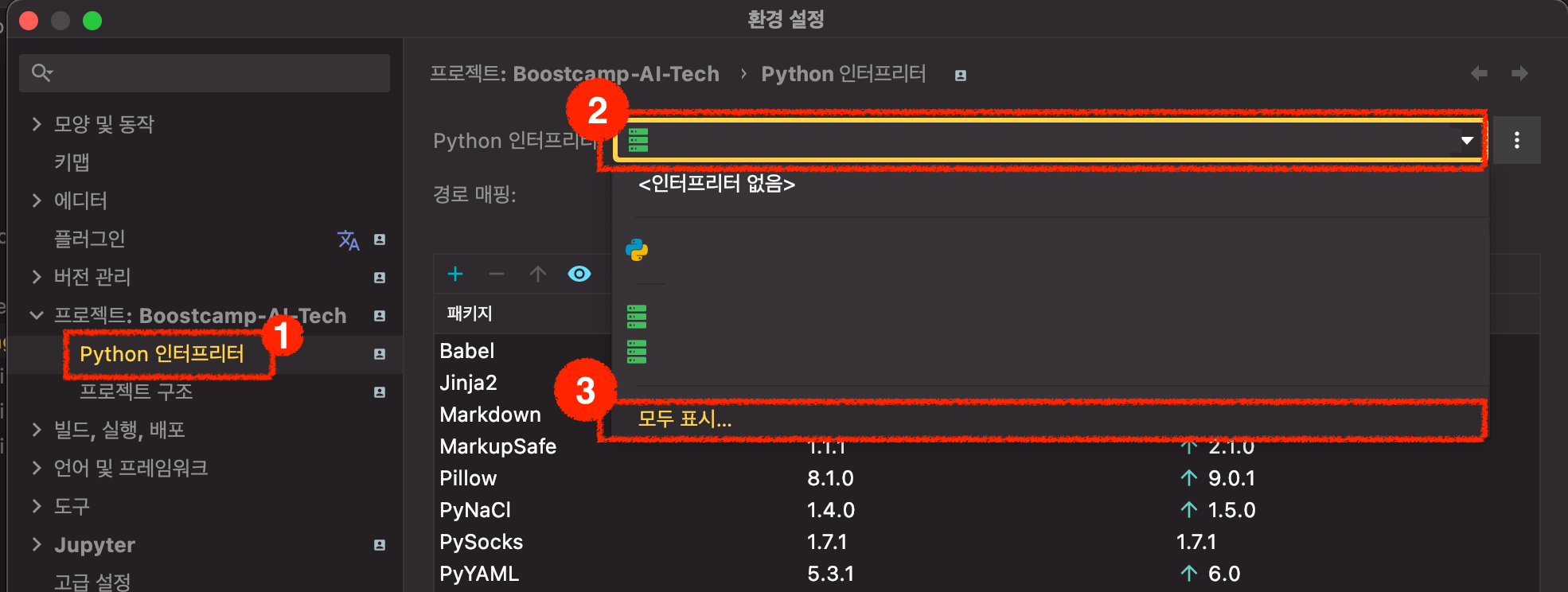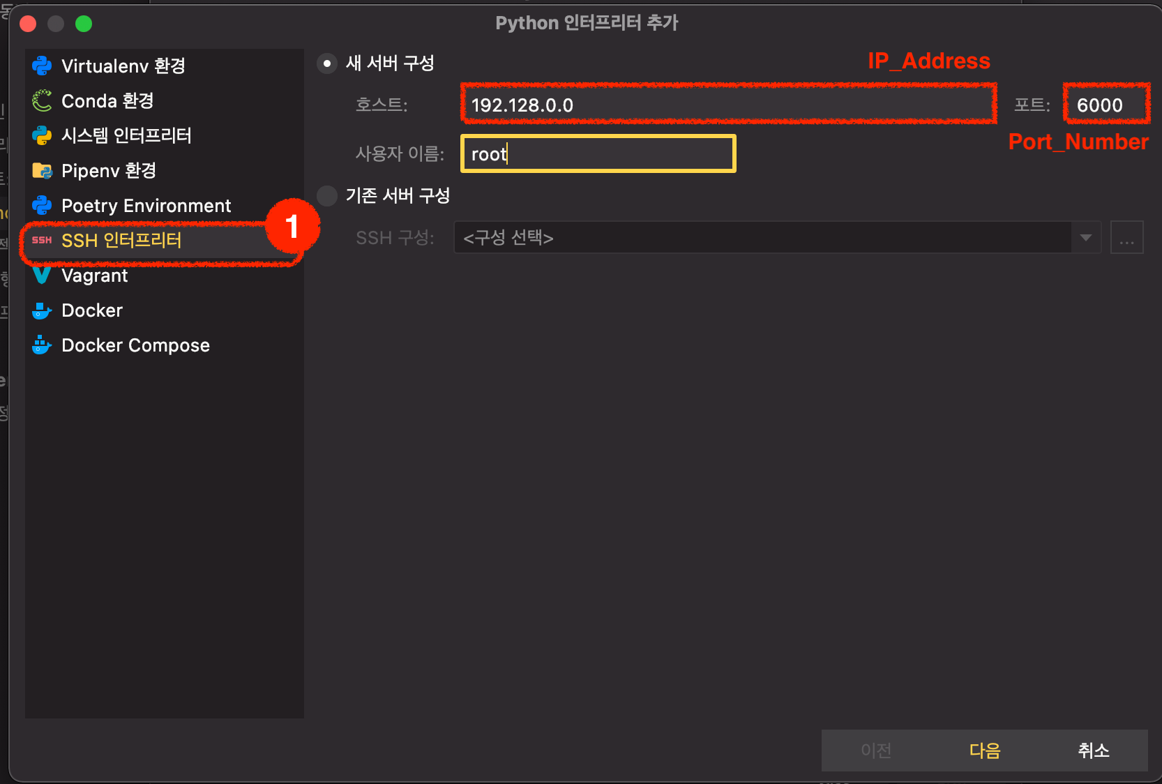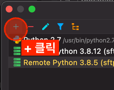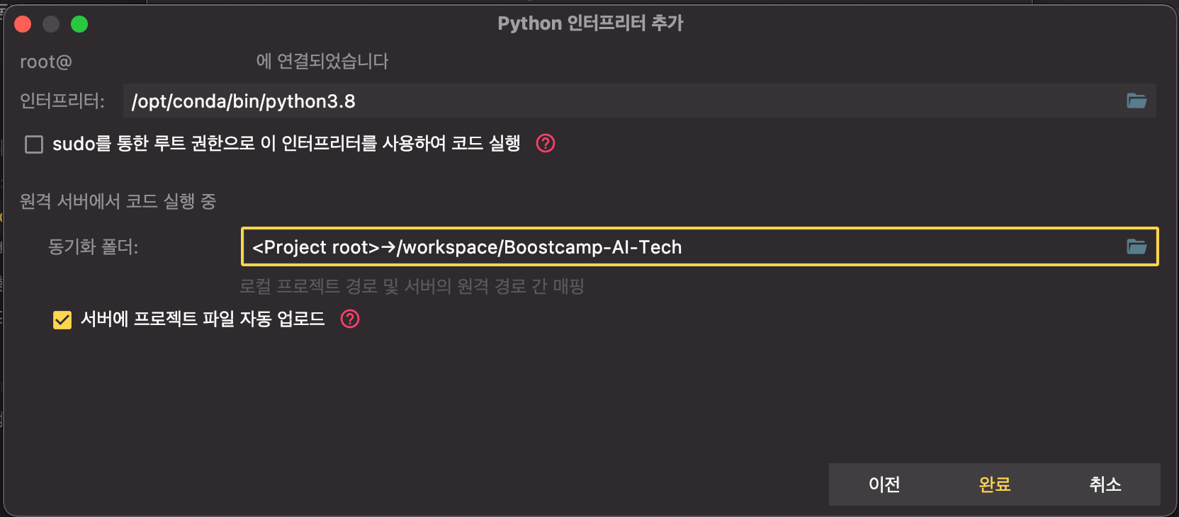 - 인터프리터 : conda(외부 서버)에 설치되어 있는 Python으로 수정